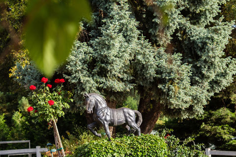 Guests have full acess to the property which feautures two barns, two riding arenas (we can arrange a horse stall if traveling with horses), and 10 acres of lush grounds, flower gardens/ orchards + apple picking, a pool and hot tub area, chickens, and even a baby cow. The front of the property offers a pergola for dining and viewing the amazing sunests overlooking Apple Hill Orchards. Our property is securely gated.